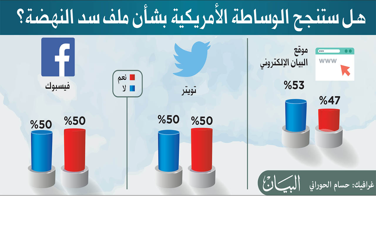أظهرت ثلاثة استطلاعات للرأي أجرتها «البيان» على موقعها الإلكتروني وحسابيها في «تويتر» و«فيسبوك» انقساماً بشأن نتائج الوساطة التي تقودها الولايات المتحدة في ملف سد النهضة حيث أعرب 49 في المئة من متوسط الاستطلاعات الثلاثة إلى أن واشنطن ستنجح في هذه المهمة في حين أعرب 51 قي المئة بأن وساطتها لن تنجح وأنه لا بد من عوامل أخرى.ويقول ورئيس الجمعية المصرية للأمم المتحدة، نبيل بدر: أعتقد بأن الوساطة الأمريكية فيما يتعلق بأزمة سد النهضة الأثيوبي، هي بمثابة تطور إيجابي ، مشيراً إلى أن الفترة الأخيرة شهدت مفاوضات ممتدة، ولم تشهد نتائج تطمئن الأطراف المختلفة، بخاصة مصر، بالنسبة لحصتها من المياه، وأيضاً الاتفاق على نظام وفترة ملء السد