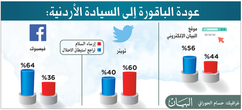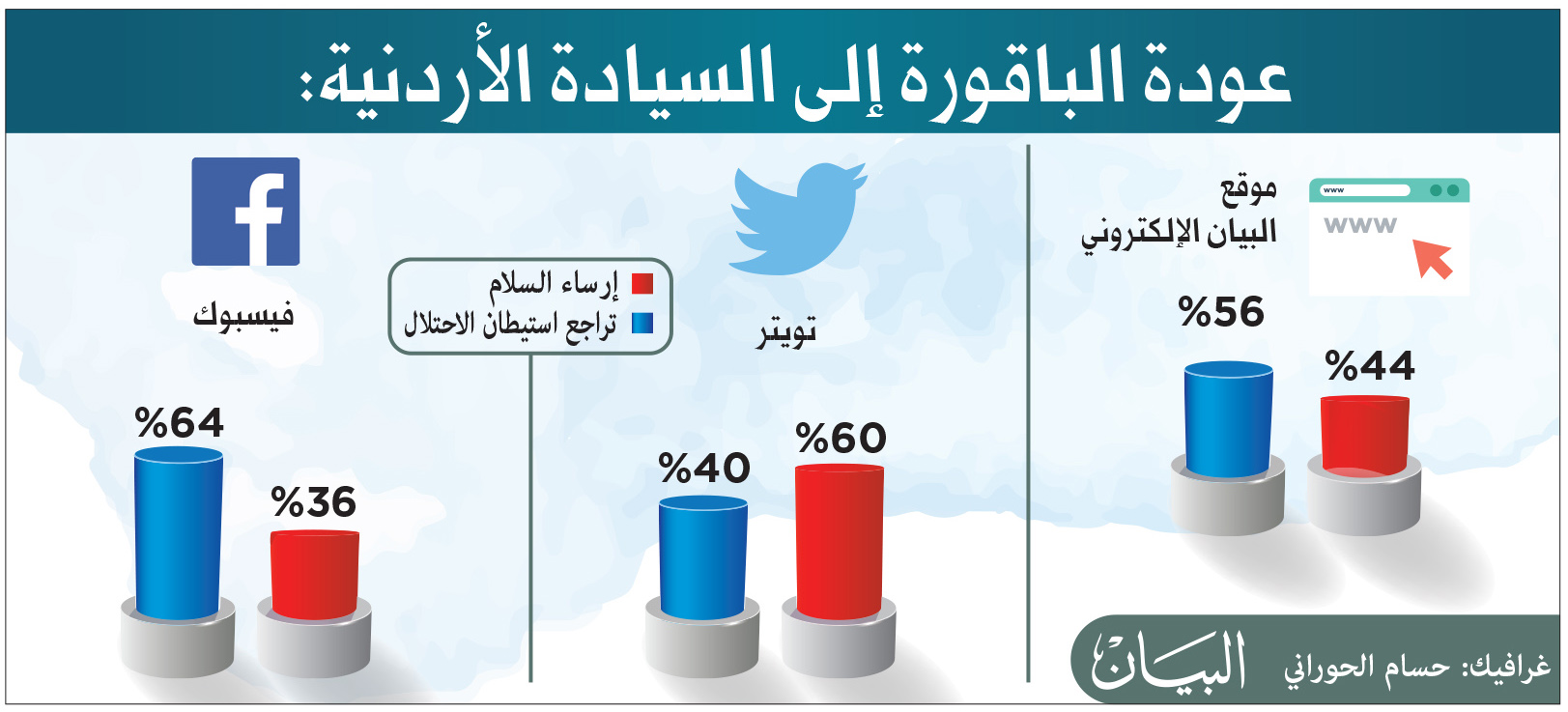 انقسم المشاركون في استطلاعات «البيان» الثلاثة على الموقع الإلكتروني و«تويتر» و«فيسبوك» بشأن آثار عودة الباقورة إلى السيادة الأردنية، ففي حين عبّر 46.67 في المئة من متوسط الاستطلاعات الثلاثة عن أن هذه الخطوة ستسهم في إرساء السلام بالمنطقة، رجّح 53.33 في المئة أنها ستسهم في تراجع مشاريع إسرائيل الاستيطانية في الأراضي المحتلة.