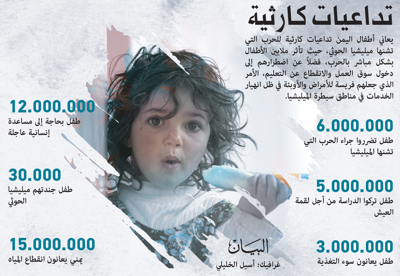 ذكرت الأمم المتحدة أن الحرب التي فجرتها ميليشيا الحوثي أفقدت أطفال اليمن المكاسب التي تحققت لهم طوال السنين السابقة، ما جعل هذا البلد ضمن أسوأ البلدان للأطفال في العالم.