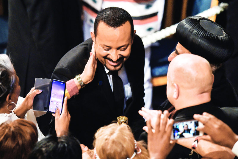وأول امس، اصطف عشرات الآلاف من المواطنين الإثيوبيين في شوارع العاصمة أديس آبابا لاستقبال آبي أحمد لدى عودته من النرويج، حيث تسلم جائزة نوبل للسلام. وارتدى كثيرون ملابس عليها صورة زعيمهم، ورددوا شعارات تشيد بآبي، الذي شارك في مراسم تسلم الجائزة في أوسلو. وقال آبي لدى وصوله إلى مطار بولي الدولي:«لقد تسلمت الجائزة نيابة عن الإثيوبيين والإريتريين».