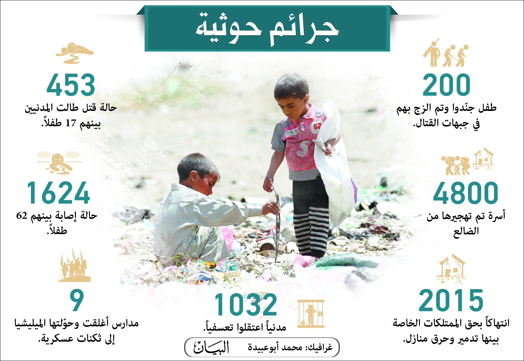 ولفتت الشبكة إلى أن الميليشيا الحوثية حولت مدرستين إلى ثكنات عسكرية، فضلاً عن إغلاق 4 مدارس أهلية. وسجل الفريق تجنيد الميليشيا الحوثية 200 طفل وزجهم في جبهات القتال.