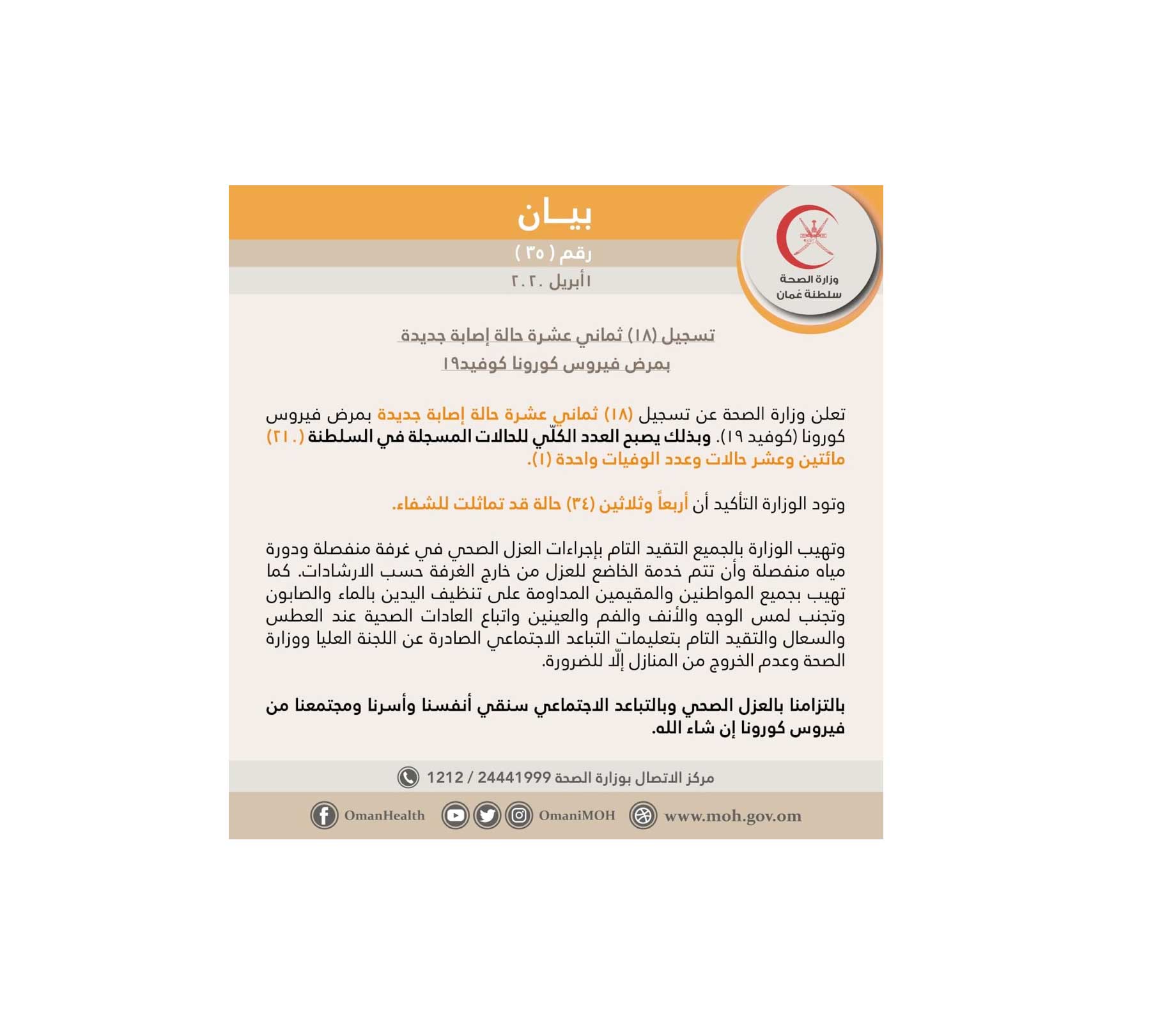 أعلنت وزارة الصحة العمانية عن تسجيل 18 حالة إصابة جديدة بمرض فيروس كورونا المستجد كوفيد 19 وبذلك يصبح العدد الكلّي للحالات المسجلة في السلطنة 210 حالات وعدد الوفيات واحدة .