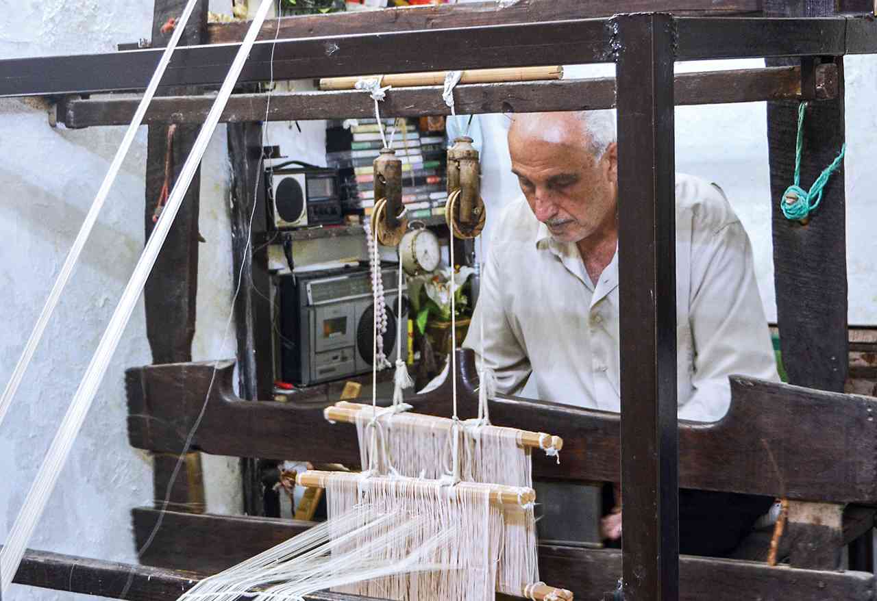 ويجلسُ محمد خلف مغزل خشبي (النول)، وينسج بيديه أمام الكاميرا، بعضاً من خيوط الحرير التي احتفظ بها، وتتزين الجدران حوله بأقمشة حرير من حياكته. وبمهارة عالية، يلفّ الخيط على يديه، ويحرّك أصابعه ورجليه على المغزل الخشبي بشكل متناسق، ويُكمل قطعة قماش بدأها قبل أشهر.