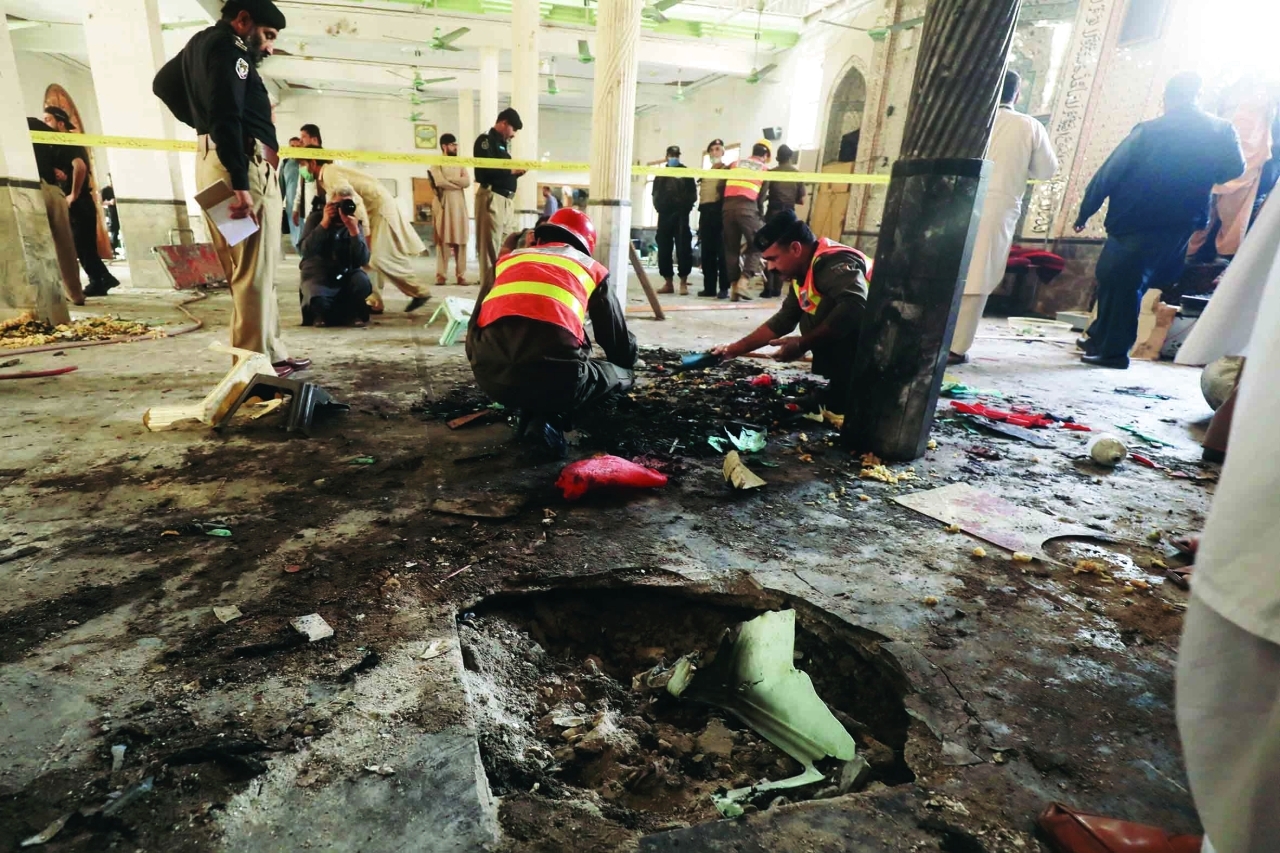 في الأثناء، قالت الشرطة، إنه تم تدبير الانفجار بدقة، ولم تعلن أي جهة بعد مسؤوليتها عنه. وصرّح المسؤول الأمني المحلي، محمد علي خان بأنّ القنبلة انفجرت في مدينة بيشاور عندما كان الطلاب يحضرون دروساً في القرآن الكريم في الصباح الباكر. وكشف أن لقطات كاميرات المراقبة أظهرت شخصاً دخل المدرسة الإسلامية الساعة الثامنة صباحاً، قبل أن يترك حقيبة مليئة بالمتفجرات داخل القاعة، مشيراً إلى أن القنبلة، التي كانت تحتوي على ستة كيلو جرامات من المواد المتفجرة، أصابت تقريباً كل من كان في القاعة، وتسببت في إحداث حفرة عميقة. وقال خان إنه جرى إغلاق المنطقة، وتبحث الشرطة عن الشخص الذي ترك الحقيبة. وقال بلال فائزي، الذي شارك في عملية الإنقاذ، إن العملية اكتملت، وتم نقل القتلى والمصابين إلى المستشفى. وأدان رئيس الوزراء الباكستاني عمران خان، التفجير، وقال إن حكومته تعمل على ضمان تقديم الإرهابيين المسؤولين عن هذا الهجوم الوحشي الجبان إلى العدالة.