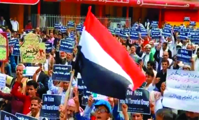 تظاهر آلاف اليمنيين في تعز، أمس للمطالبة بتصنيف ميليشيا الحوثي جماعة إرهابية.