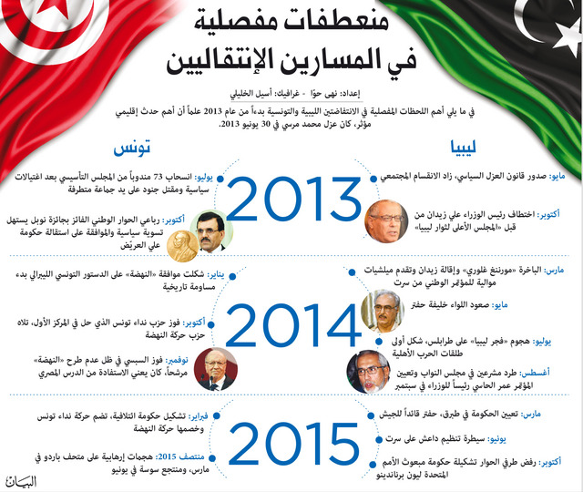 في أعقاب الإطاحة بالرئيسين التونسي زين العابدين بن علي والليبي معمر القذافي، انطلقت كل من الانتفاضتين التونسية والليبية في مسار سياسي ديمقراطي، تم خلاله انتخاب جمعية تأسيسية لصياغة دستور وصولاً إلى عقد انتخابات برلمانية، لكن فيما تمكنت تونس من عبور مرحلة انتقالها السياسي وأصبح لديها برلمان وحكومة ورئيس إلى جانب دستور يحكمها، تعيش ليبيا أوضاعاً صعبة بحكومتين ومجلسين، واحد منهما معترف به دولياً، إلى جانب عشرات الميليشيات بما في ذلك تنظيم داعش الذي كان يتوسع على حساب الطرفين، بعد سيطرته على مدينة سرت وسط البلاد.