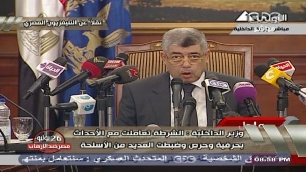وأضاف وزير الداخلية في مؤتمر صحافي عالمي أن قرار فض اعتصامات الإخوان جاء بعد القتل والتحريض على العنف، معلناً أن قوات الشرطة سقط منها 43 قتيلاً منهم 18 ضابطاً خلال الاشتباكات مع أنصار الرئيس المعزول محمد مرسي، كما سقط 149 مدنياً في عموم مصر.