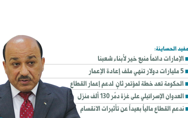 وأكد وزير الإشغال العامة الفلسطيني د. مفيد الحساينة في حوار اجرته معه «البيان» أن الظروف السياسية في الشارع العربي والتي نتجت عن الربيع العربي انعكست سلباً على إعادة أعمار غزة، بعد انشغال عدة دول عربية بشأنها الداخلي، وتلاشت دول عن الخريطة بعد انقساماتها الداخلية، والتي تتطلب إعادة الحياة لهذه الدول، مليارات الدولارات، في حين تبحث الحكومة الفلسطينية عن 5 مليارات دولار لإنهاء ملف إعمار غزة.