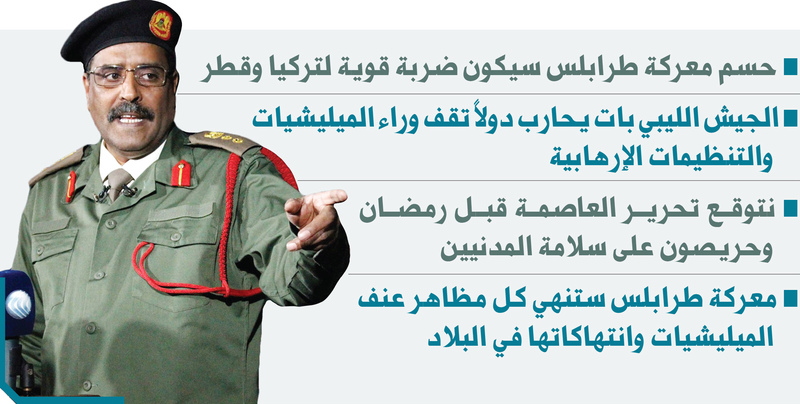 هناك محاولات يائسة من قبل ميليشيا طرابلس لاختراق صفوف الجيش لوقف تقدمه نحو تحرير العاصمة، لكن نحن لها بالمرصاد، نحن حريصون على إنهاء المعركة قريباً، أي قبل رمضان، مع ضمان سلامة المدنيين، على اعتبار أن «الجماعات الإرهابية» المتحصنة في طرابلس تتخذ من الأحياء السكنية «دروعاً بشرية»، لكن وضعنا خطة محكمة كفيلة بمواصلة معركتنا دون المساس بحياة المدنيين، فميليشيا طرابلس تعتمد على إمدادات من جماعات إرهابية كالقاعدة وداعش والمرتزقة، كما تحاول تجنيد ليبيين مرتزقة للقتال ضد الجيش الوطني لمنع تحرير طرابلس، لكن كل محاولاتهم باءت بالفشل.