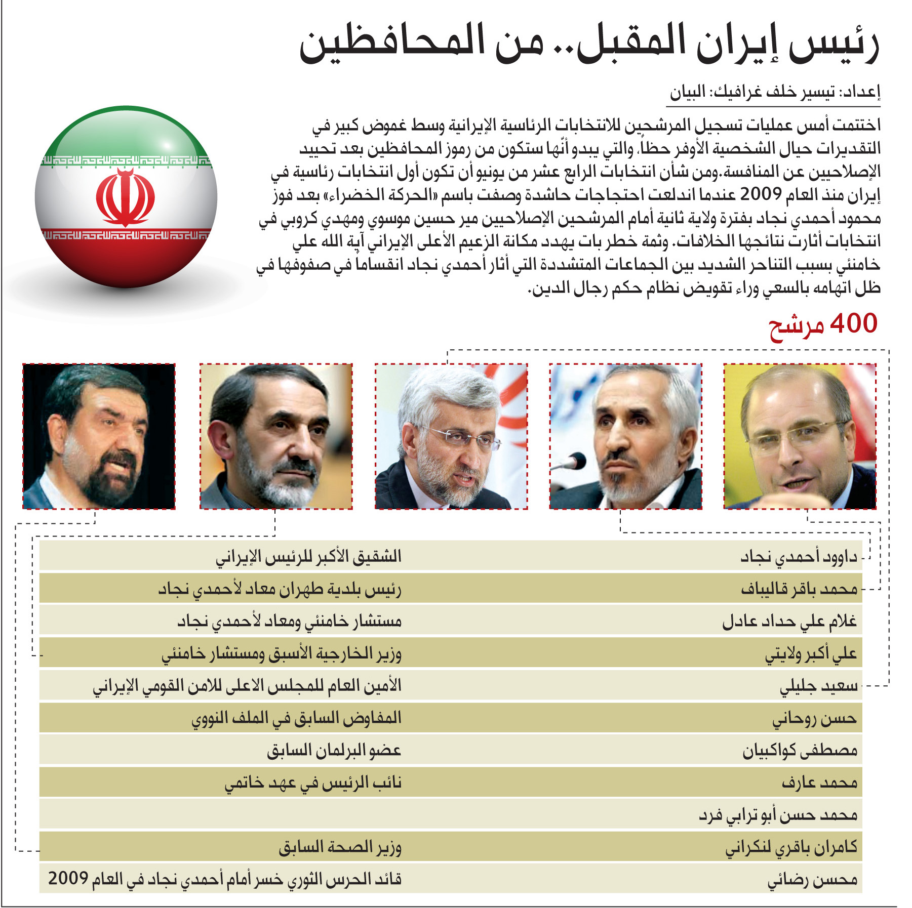 وأقفل باب الترشح للانتخابات الرئاسية في غياب واضح للأسماء الإصلاحية، في حين تقدم مستشارون سابقون وحاليون ومقربون من المرشد علي خامنئي لقطع الطريق على فوز مرشحين مقربين من الرئيس نجاد الذي تعاني علاقته مع المرشد أزمة مستعصية.