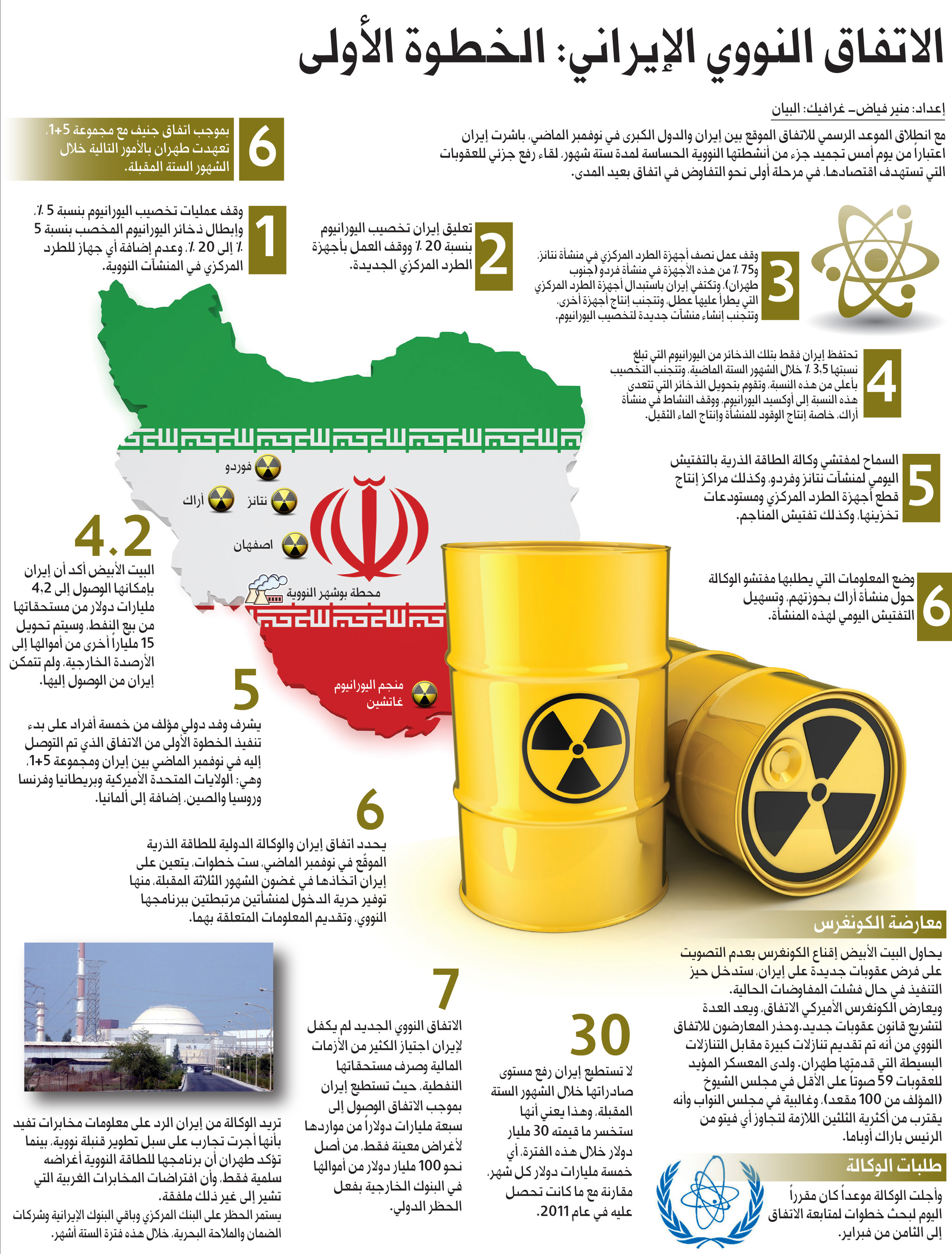 خطا الاتفاق النووي الإيراني الدولي خطوته الأولى نحو التطبيق، مع إعلان طهران تعليقها نشاطات تخصيب اليورانيوم بنسبة 20 في المئة، في إطار الاتفاق الموقع مع القوى الكبرى. ورداً على ذلك، خففت كل من الولايات المتحدة والاتحاد الأوروبي سلسلة من العقوبات الاقتصادية على ايران لمدة ستة اشهر، فيما رفعت الوكالة الدولية للطاقة الذرية تقريراً يؤكد بدء تجميد الأنشطة.