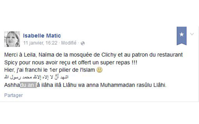 وكتبت إيزابيل لفظ الشهادتين " أشهد أن لا إله إلاّ الله و أنّ محمدا رسول الله " في حسابها على الفيسبوك .