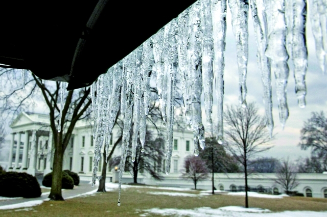 جليد أ ف برقاقات الجليد تتدلى قرب سياج في البيت الأبيض، بعد عاصفة ثلجية في واشنطن أدت إلى تعطل في حركة النقل