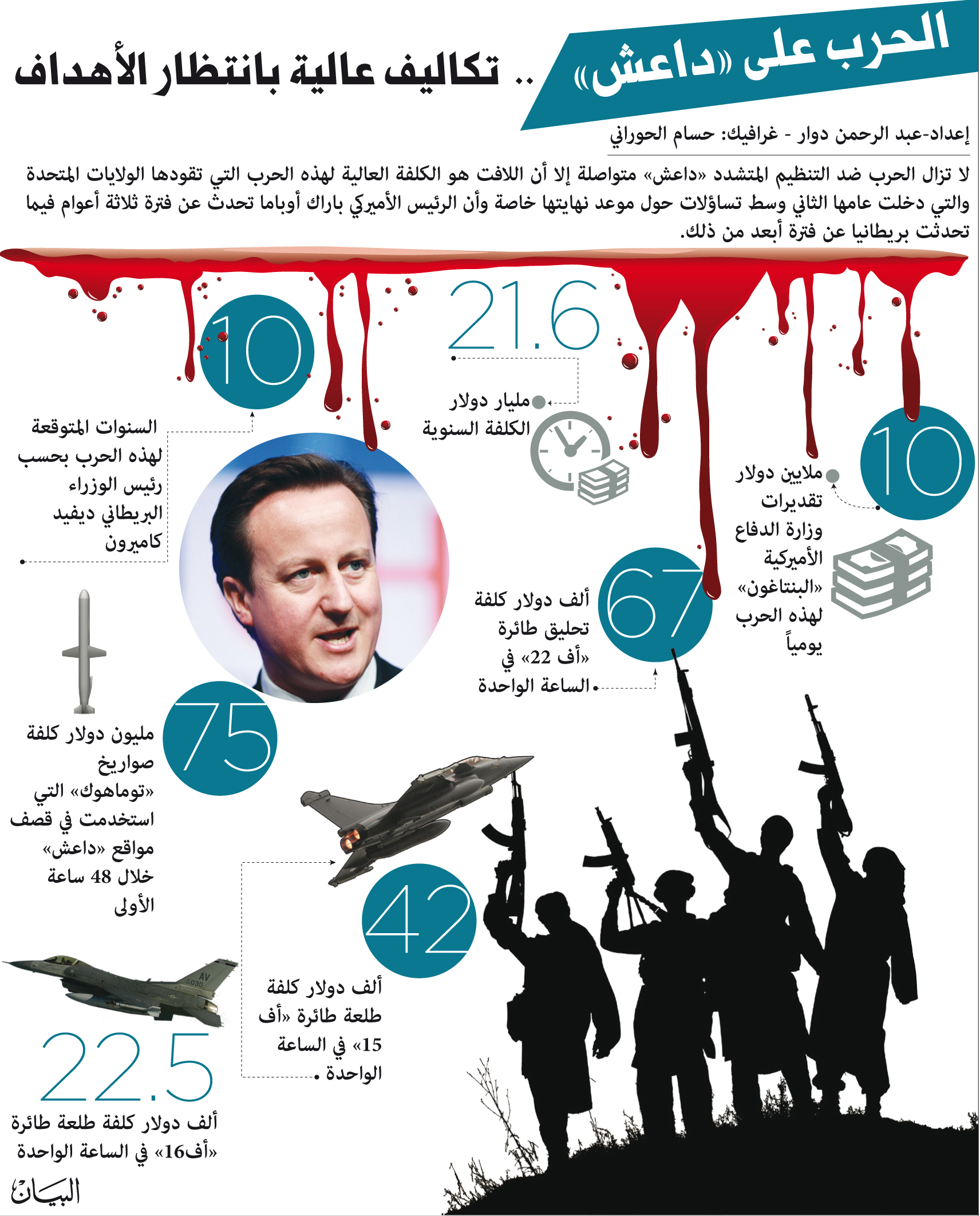 وتلعب بريطانيا دوراً بارز في التحالف الدولي ضد تنظيم داعش، وساعدت الحكومة العراقية في استعادة 25 في المئة من الأراضي التي سيطر عليها داعش، واسترجاع 200 كيلومتر مربع في الشمال، فضلاً عن استعادة مدينة تكريت في الوسط وعودة 100 ألف مواطن إليها، وإخراج التنظيم من محافظة ديالى في الشرق.