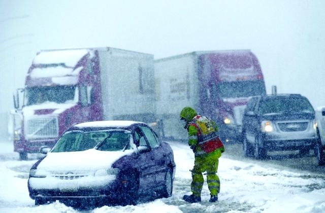 ثلوج أ.ب■ عنصر من الدفاع المدني يتحدث إلى سائق علقت سيارته في أحد شوارع مدينة نيفادا الأميركية، حيث تشهد الولايات المتحدة هذه الفترة تقلبات في الطقس مصحوبة بموجة برد قارس وتساقط كثيف للثلوج أدى إلى قطع الطرق في العديد من المدن