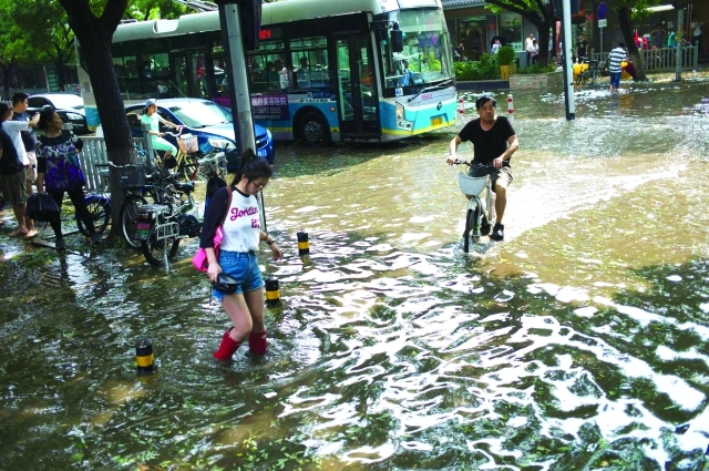فيضانات أ. ف. بصينيون يعبرون شارعاً غمرته مياه الأمطار في العاصمة بكين حيث تشهد الصين هذه الفترة موجة من تقلبات الطقس أدت إلى سقوط أمطار غزيرة ما تسبب بإرباك حركة السير في العديد من المدن