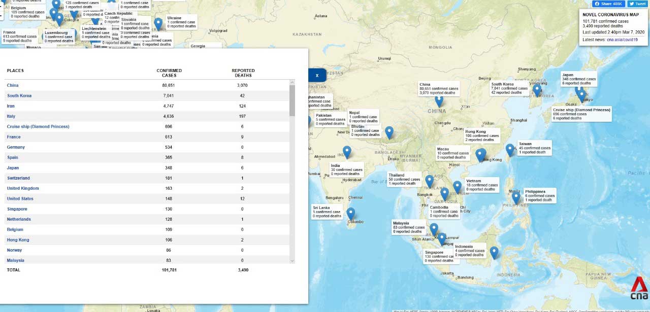 ووفقاً للخريطة التفاعلية العالمية CNA التي ترصد إصابات الفيروس حول العالم على مدار الساعة فإن أعلى 6 دول تسجيلاً لحالات الإصابة بفيروس كورونا المستجد كان في الصين بواقع 80651 إصابة، و3070 وفاة، وكوريا الجنوبية 7041 إصابة و42 وفاة، وإيران 4747 إصابة، و124 وفاة، وإيطاليا 4636 إصابة و197 وفاة، وفرنسا 613 إصابة و9 وفيات، إلى جانب 696 إصابة و6 وفيات في سفينة دايموند برنسيس في اليابان.