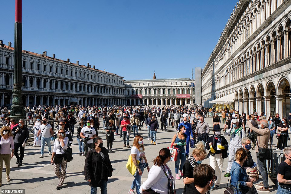 وفي البندقية، حيث كانت الشوارع والأزقة فارغة لأسابع، دبت الحياة مرة أخرى في ساحتها الشهيرة "سانت مارك" التي امتلأت بالسكان أمس بعدما اجتمع التجار المحليون في الساحة.