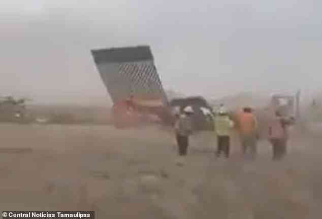 ويظهر مقطع الفيديو الذي نشره الصحفي ياديث فالديز على تويتر أمس الأحد عمال البناء وهم يقفون جنباً إلى جنب بينما يشاهدون الهيكل الفولاذي للجدار يسقط أرضا بسبب العواصف الشديدة.