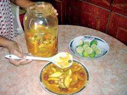 وباتت في الآونة الأخيرة ربات البيوت تستعد لصناعة «مخلل المانجا» بتجهيز زجاجات كبيرة معقمة وملؤها بقطع المانج الخضراء لتخليلها باضافة الخل أو الليمون لبقائها أطول فترة ممكنة، وتختلف طريقة الإعداد من بيت لآخر بإضافة المطيبات المختلفة التي تتناسب مع ذوق أهالي المنزل، فالبعض يفضل المخللات حامية الطعم بإضافة قرون من الفلفل الأحمر أو الأخضر، أما البعض الآخر فيفضلها أن تحتفظ بخواصها وطعمها الحامض لاستخدامها في موسم الشتاء للاستمتاع بطعمها وثمرتها التي لا تتواجد في هذا الموسم.