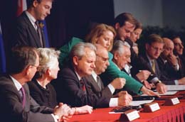وبرعاية الولايات المتحدة ، انطلقت مسيرة المفاوضات من 1 إلى 21 نوفمبر 1995 في قاعدة رايت بيترسن الجوية قرب مدينة دايتون الأميركية. وترأس الوفود المشاركة كل من الرئيس اليوغوسلافي سلوبودان ميلوسيفيتش من الجانب الصربي، والكرواتي فرانجو تودمان والبوسني علي عزت بيغوفيتش .