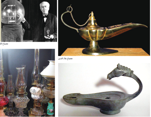 أو في الأماكن المظلمة نهاراً، وحصل على الإضاءة في البداية من عملية حرق الحطب، ثم تطورت عملية تأمينها، فحصل عليها من الشعلة بإحراق عيدان الخشب المغمسة بمواد شحميّة أو زيتيّة نباتيّة وحيوانيّة، لإدامتها أطول مدة ممكنة. وبعدها اكتشف المصباح، والسراج والفانوس والكاز، باستخدام أوعية من الزجاج أو المعدن أو الحجارة أو الخزف، مزودة بفتيل مغموس بزيت سائل قابل للاحتراق، وبالتالي توليد الضوء المطلوب.