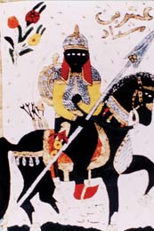 وأمام رسومه، يشعر المتلقي أنه أمام طفل كبير، يمارس لعبة الرسم والتلوين بحرية وشفافية كبيرتين، وفي نفس الوقت، بأصالة وصدق وخبرة وإتقان ومهارة الحرفي الذي لا يغش في منتجه، بدليل أنه في إحدى لوحاته الأثيرة التي رسم فيها عنترة وعبلة.