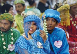 أما في جزيرة جاوه الاندونيسية، فتقوم العروس بغسل قدمي الزوج بماء المحيط عدة مرات ككناية لاستعداد العروس (الزوجة) أن تقوم على خدمة زوجها العمر كله، ويقوم الزوج بدوره بنثر العطر المقطر من الزهور على رأس العروس ككناية لرعايتها طوال العمر بكل الرضا والمحبة، ثم يجلسان وسط الحضور بزي اندونيسي تقليدي باهظ التكلفة.