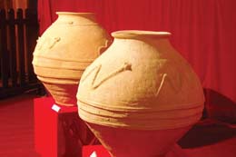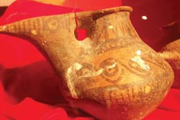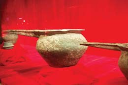 في قاعة خصصت لمعروضات الموقع الآثاري «ساروق الحديد» الذي اكتشفه للمرة الأولى صاحب السمو الشيخ محمد بن راشد آل مكتوم نائب رئيس الدولة رئيس مجلس الوزراء حاكم دبي قبل ست سنوات بعد ان لاحظ سموه وفي موضع تغطيه رمال الصحراء تلك الأشياء الصغيرة اللامعة بين حبات الرمل، تتوزع قطع من الفخاريات والمشغولات البرونزية، جرار لحفظ الماء أو الطعام، رؤوس حراب، أساور وحلي نسائية وخواتم.. حراب صغيرة مسننة وأخرى كبيرة، تحيل للتفكير في الأمر، فالحراب الصغيرة تبدو وكأنها معدات لصيد الحيوانات والحراب الكبيرة تحيلك إلى فارس قد استعد لحرب أو خاضها.