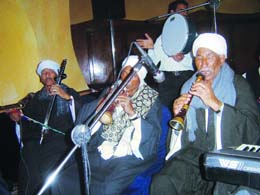 وهو لايزال يفعل إلى الآن رغم اكتشافه لهذه الآلات، وثانيها آلات النفخ ولعل أقدمها تلك القصبات المجوفة المختلفة الأطوال المثقوبة وغير المثقوبة والتي تفنن المصري في صنعها وتطويعها لتعطيه أصواتاً ونغمات جديدة متنوعة، ويضم هذا النوع آلات دون ريشة مثل السلامية، وآلات مزودة بريشة كالأرغول والقرمة والستاوية والمقرونة والمزمار البلدي، وثالثها آلات النبر أو الجر بالقوس على الأوتار (التوترية) .