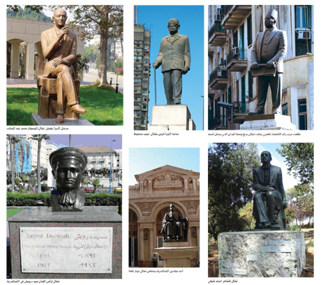 وذلك مثل محمد علي باشا وإبراهيم باشا وبوغوص نوبار باشا ومصطفى كامل وسعد زغلول وعبد المنعم رياض وعمر مكرم، وأيضا سيد درويش ومحمد عبد الوهاب وأم كلثوم ونجيب محفوظ وطه حسين وأحمد شوقي وأحمد رامي، وغيرهم العديد من المبرزين في شتى مجالات الفكر والسياسة والفن، وهي بطبيعة الحال كانت نتاجا لجهد وتميز نحاتين مصريين معروفين يتقدمهم محمود مختار وعبد العزيز صعب ومنصور فرج و محمد حلمي يوسف وجمال السجيني ، إلى جانب عدد آخر من النحاتين الأجانب مثل الفرنسيين «كوردييه» و»ليوبولد سافان». إن الشيق في حكاية تخليد فن النحت لعظمة إسهام رواد الفن والفكر والسياسية في الوطن، هو تركيز الشعب في مصر وبالتعاون مع الحكومات المتعاقبة على اختيار هذا المنوال والتقليد ليكرم عظمائه ومبرزيه فيخلد ذكراهم، وها هو تمثال سعد زغلول الذي نحته محمود مختار ينتصب عند مدخل كوبري قصر النيل ليبقى شاهدا على دور وتاريخ هذا الزعيم الوطني الذي قاد ثورة 1919 م في مصر، وطبعا لم تهنأ أو ترض الإسكندرية إلا بوجود تمثال خاص بها ، فظهر تمثال زغلول فيها بالقرب من محطة الرمل، واللافت هنا أن هذين التمثالين كانا بتكليف من الحكومة المصرية.