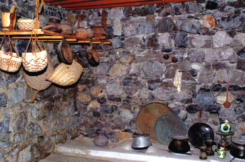 بالمقابل تنتقل القرية بنا إلى نموذج آخر من البيوت التي كان أهل الجبل يستخدمونها في الماضي، مثل بيوت «الصفة أو العقة» التي كانت تبنى من الحجارة وتتميز بكثرة فتحاتها، حيث كان أهل الجبل يستخدمونها كمجلس لاستقبال الضيوف، وكمصيف في الوقت ذاته.