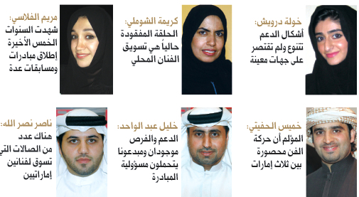 ومن جهتها، قالت الفنانة كريمة الشوملي، والتي باتت من الأسماء البارزة في الساحة الفنية، ضمن حقل الفن التركيبي والمفاهيمي، كما تعد حالياً لشهادة الدكتوراه بمنحة من (جائزة الشيخة منال للفنانين الشباب) وأيضاً (هيئة أبوظبي للثقافة والتراث): «الدعم والاهتمام متوافران، لكن الحلقة المفقودة حالياً، هي تسويق الفنان المحلي، أسوة بالنهج الذي تتبعه صالات الفن الخاصة التي تسوق للفنانين المشاركين في معارضها.