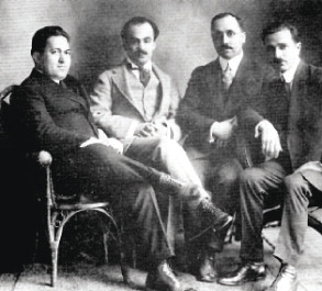 والصورة تجمع من اليمين لليسار كلاً من: ميخائيل نعيمة، عبدالمسيح حداد، جبران خليل جبران ونسيب عريضة.