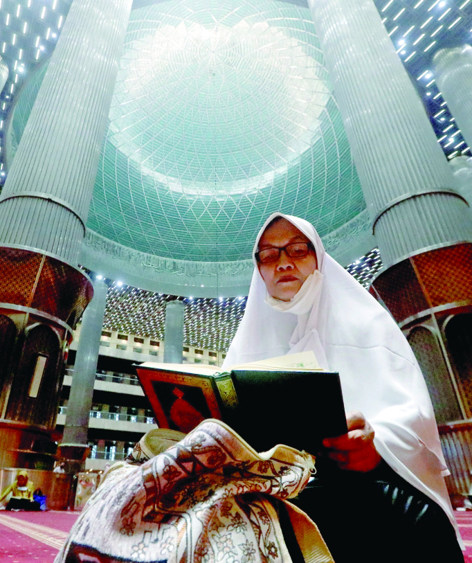 روحانيات (وكالات)امرأة إندونيسية تقرأ القرآن في مسجد الاستقلال بالعاصمة جاكرتا قبيل انطلاق مدفع الإفطار في طقس روحاني رمضاني يحرص عليه الصائمون.