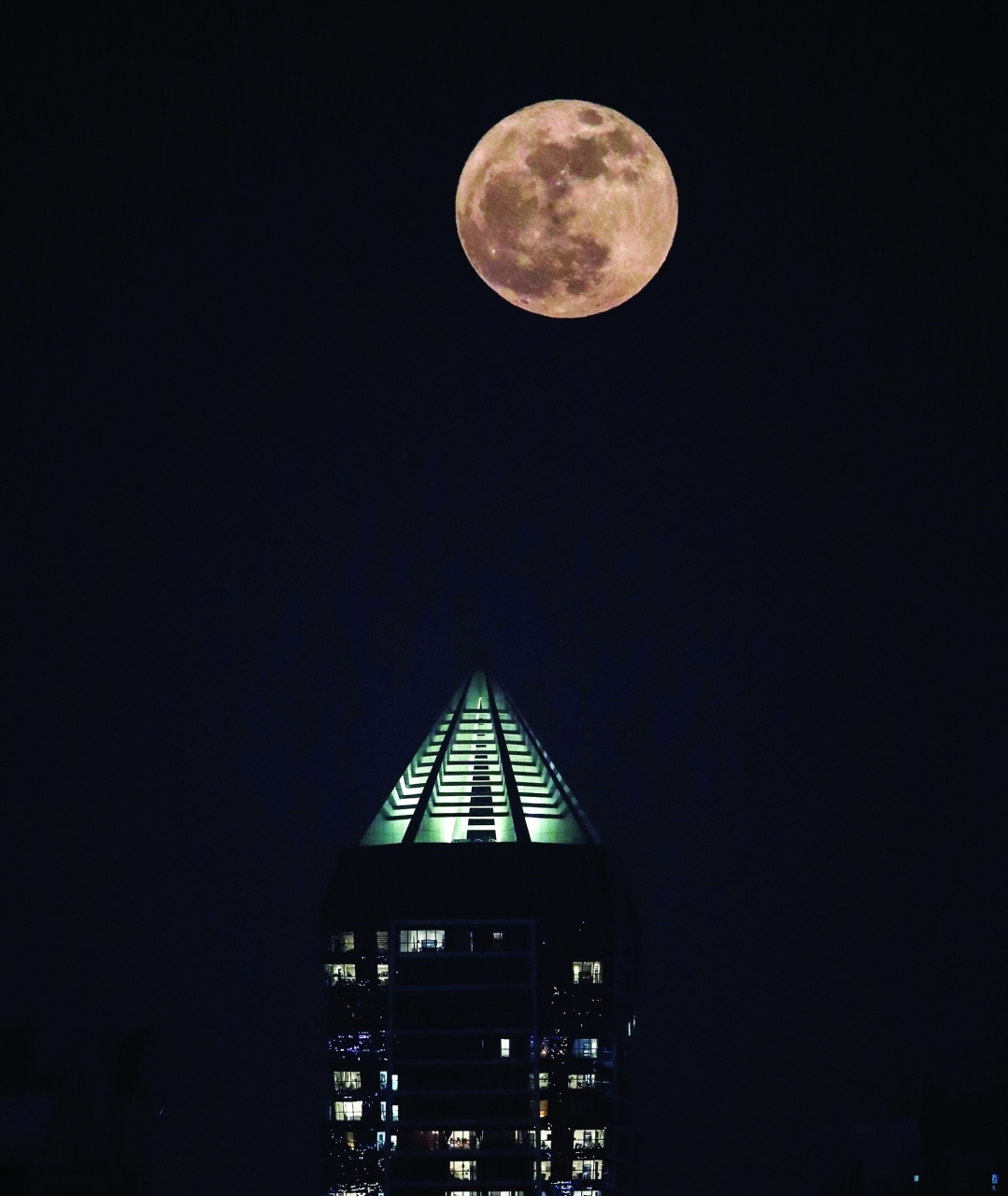 «القمر العملاق» بدبي (أي بي إيه)أطل القمر على مدينة دبي، في ظاهرة «القمر العملاق» حيث يكون القمر في المسافة الأقرب إلى الأرض خلال العام، ورسم بضيائه لوحة جمالية بانورامية ساحرة تزينت بها سماء المدينة وازدانت بها معالمها البارزة.