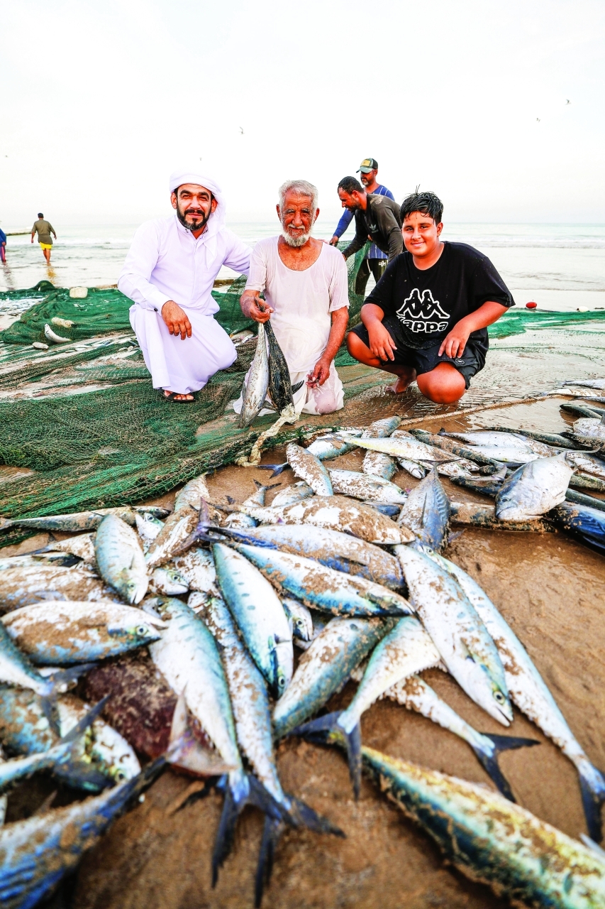 صيادون في شاطئ العقة بالفجيرة، الواقع في واحدة من أجمل مناطق السياحة في الإمارات، حيث يفد إليه الزائرون من مختلف أنحاء العالم، للاستمتاع بما يتوافر فيه من مقومات طبيعية ومرافق متنوعة، تهيئ لهم أجواء ترفيهية متميزة والقدرة على مزاولة العديد من الأنشطة الممتعة، ومنها صيد السمك.
