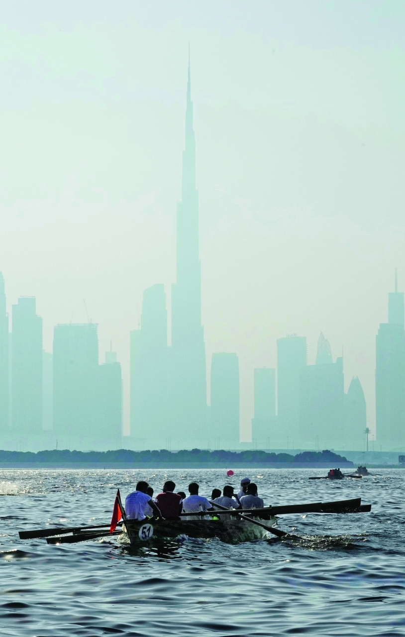 ثرية المضامين والجمال مشاهد دبي وقصص الحياة فيها، ففي كل مجال تنسج المدينة حكاية تفرد ساحرة. إلا أن رونقها الأبهى يتبدى في ما تصوغه من ألوان تناغم بين الحداثة والتراث. إذ يتبدى جانب من هذه الرؤية في الصورة، التي يظهر فيها مشاركون في بطولة دبي لقوارب التجديف المحلية في قناة دبي المائية بمنطقة الجداف، وخلفهم بريق صروح دبي الشامخة، ومنها برج خليفة، أعلى مبنى في العالم.