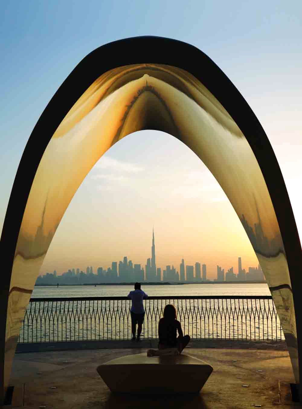 حيث تتشكل في ضوء هذه الحكايات الأخاذة، لوحات جمالية فريدة توفر متعة كبيرة لساكني دبي وزائريها، ذلك كما يتبدى في الصورة التي يظهر فيها سائحان يطالعان مشهداً بديعاً للمدينة من ضفاف خور دبي.