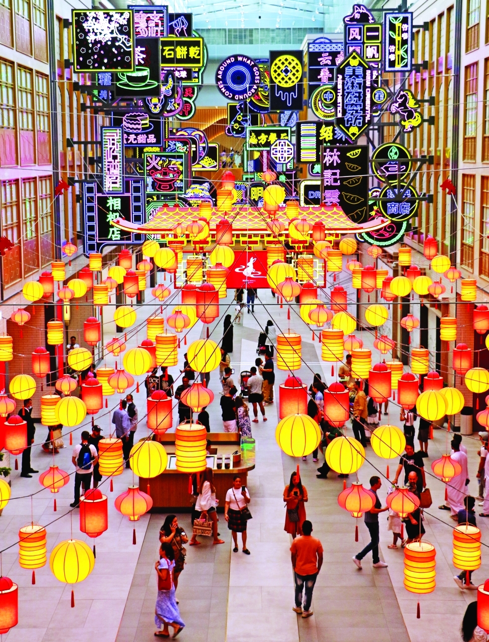 ضم «دبي مول»، أكبر مركز للتسوق في العالم، إلى أروقته وجهة «تشاينا تاون»، التي تأخذ حيّزاً كبيراً في الطابق الأول منه، وتشمل العديد من المرافق الخدمية والترفيهية، التي تنقل زوارها إلى عالم الصين، المزين بالفوانيس الحمراء الكلاسيكية والأضواء وتماثيل دبّ الباندا. وفي الصورة، زوار يلتقطون الصور في ردهات «تشاينا تاون».