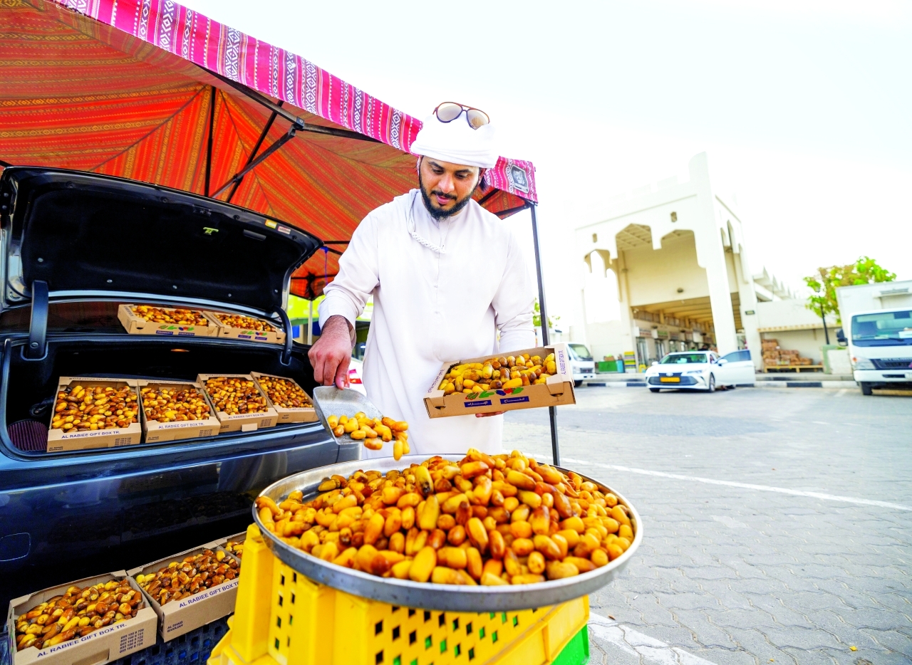 والخضروات، حيث يبرز فيها أحد التجار العمانيين وهو يبيع الرطب.