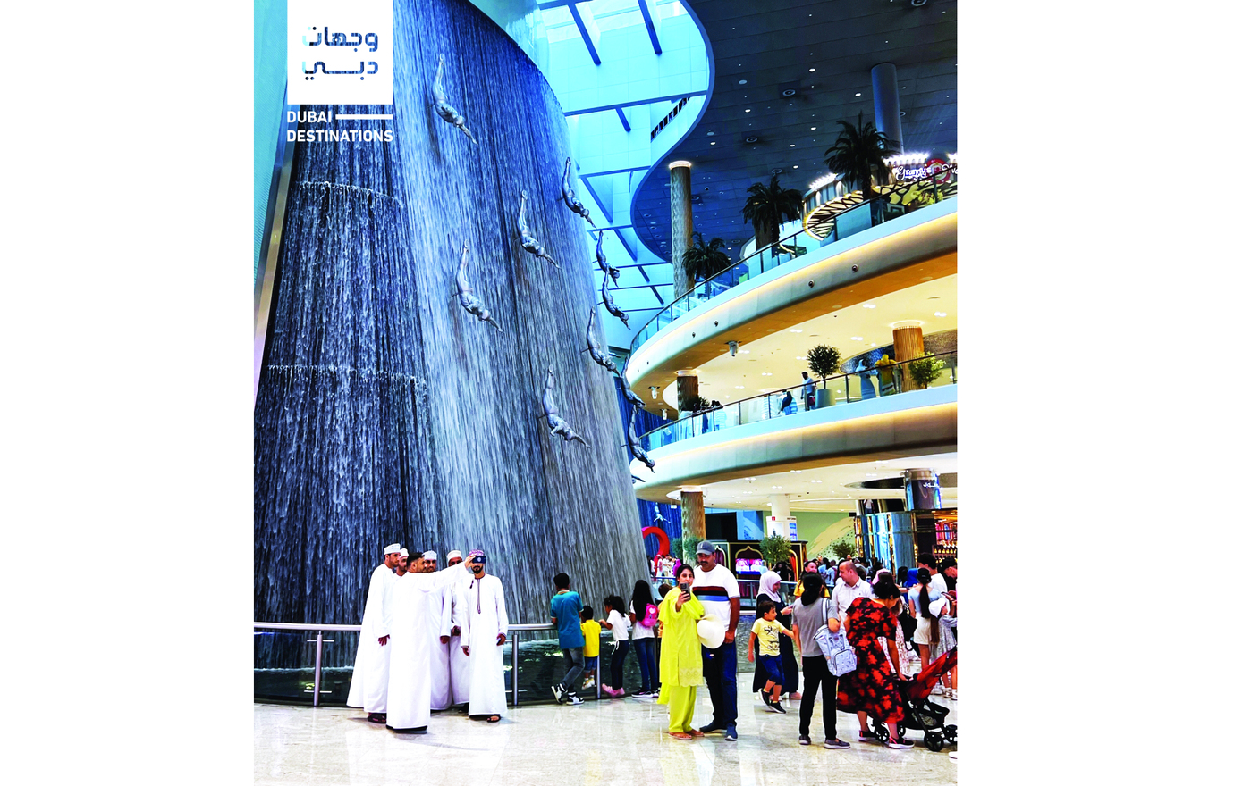 يعد «دبي مول» وجهة مثالية للترفيه والتسوق والمرح. وفي الصورة، الزوار يستمتعون بمشاهدة شلال «دبي مول» الذي يبلغ ارتفاعه 24 متراً، ويجسد صورة مجموعة من الغطاسين، ليضيف على المكان جمالاً يتناغم مع إيقاع جريان المياه، عاكساً أجواء المتعة والرقي التي يحفل بها المول.