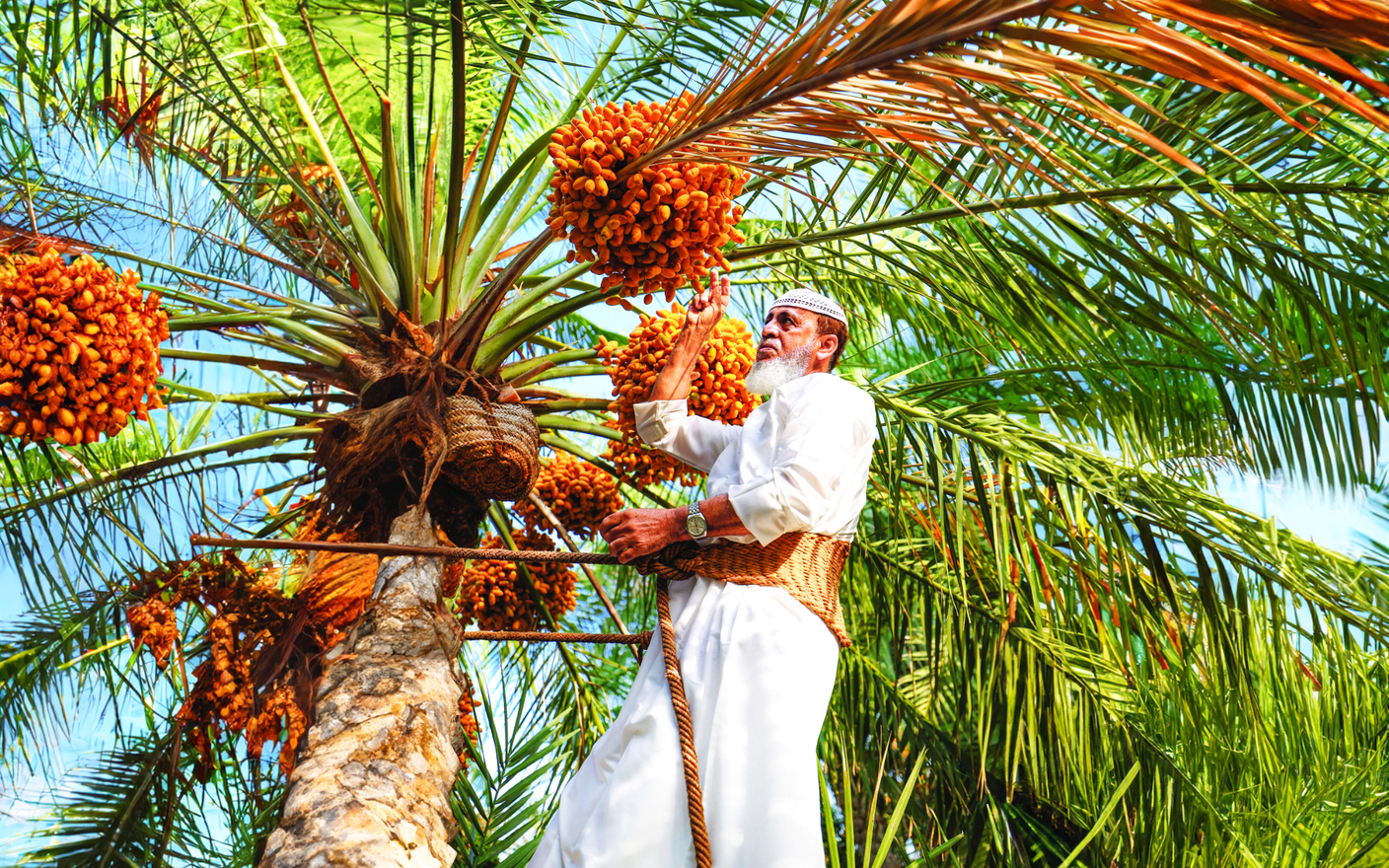 عنوان الخير والبركة تصوير: زيشان أحمدخلفان النقبي من منطقة اللؤلؤة في خورفكان يعمل في مزرعته على جني التمر من شجرة النخيل، حيث لا تزال هذه الشجرة عنوان الخير والبركة
