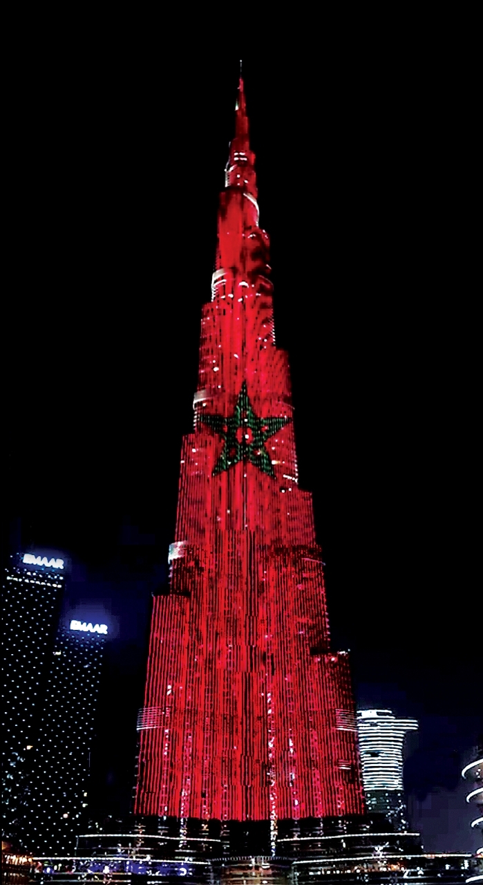لفتة إنسانية عميقة الدلالات والأبعاد، تروي نهج دولة الإمارات ورفعة قيمها ورسوخ توجهاتها الخيرة، جسّدها ورسم ملامحها برج خليفة في دبي، الذي ازدانت واجهته بعلم المملكة المغربية، تعبيراً عن التضامن معها في كارثة الزلزال الذي طال مناطق عدة فيها، يوم الجمعة الفائت، حيث كانت الإمارات في مقدمة الدول التي سارعت إلى تقديم العون والإغاثة للأشقاء في المغرب.