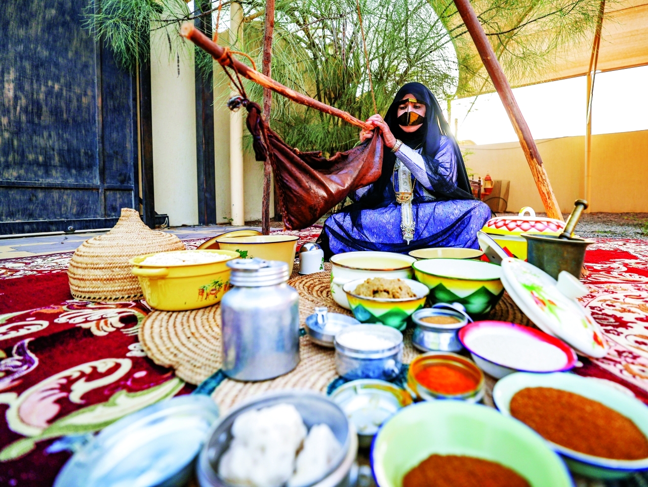 وفي الصورة، مريم سعيد الواجف المزروعي، رئيسة اللجنة النسائية في فريق البرزة لتنظيم وإدارة الفعاليات التراثية، من منطقة وادي العيم برأس الخيمة، تعرض الطريقة التقليدية لصنع اللبن.
