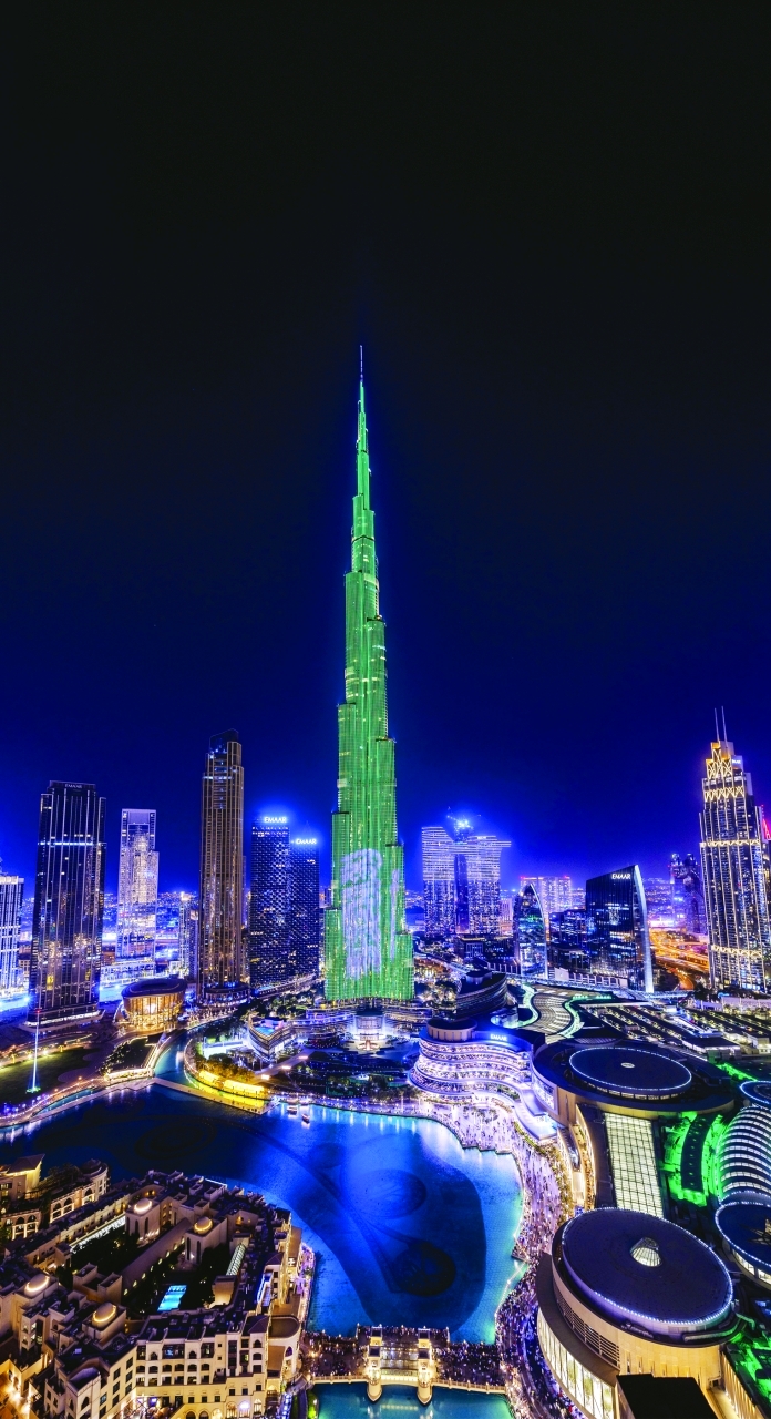برج خليفة يتزين بألوان العلم السعودي، حيث تشارك الإمارات سنوياً المملكة العربية السعودية الاحتفال بيومها الوطني، تجسيداً لعمق العلاقات التي تربط البلدين، وتأكيداً على روح الأخوة والصداقة والمحبة بين الشعبين الشقيقين.