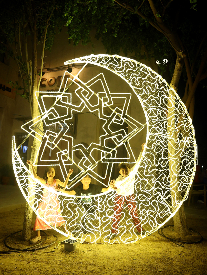 أجواء رمضانية مميزة يعيشها سكان وزوار دبي، حيث تزدان وجهات وشوارع المدينة بالزينة والإضاءة والتصاميم البديعة، التي تجسد روح رمضان المبارك، وتضفي مزيداً من البهجة والسعادة على أجواء الشهر الفضيل. وفي الصورة أطفال يلهون بجانب أحد التصاميم الجميلة في شارع السيف.