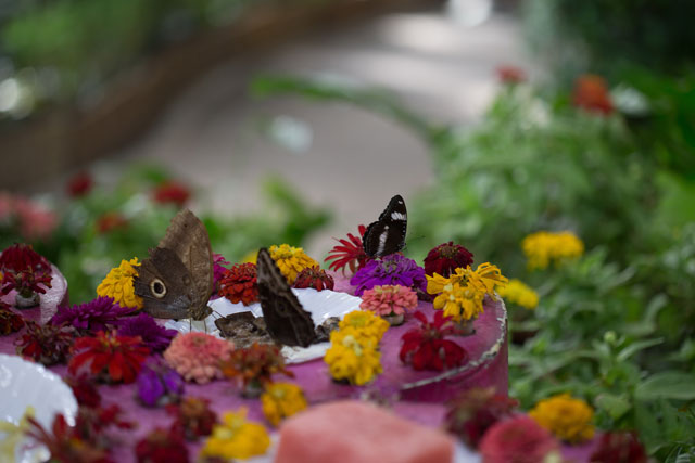 وفوق مجموعة من الزهور والنباتات، تطير الفراشات في المساحة المغطاة لتملأ أجواء الحديقة بالفرح والبهجة عندما تحط على أيدي الزوار أو أكتافهم أو رؤوسهم.