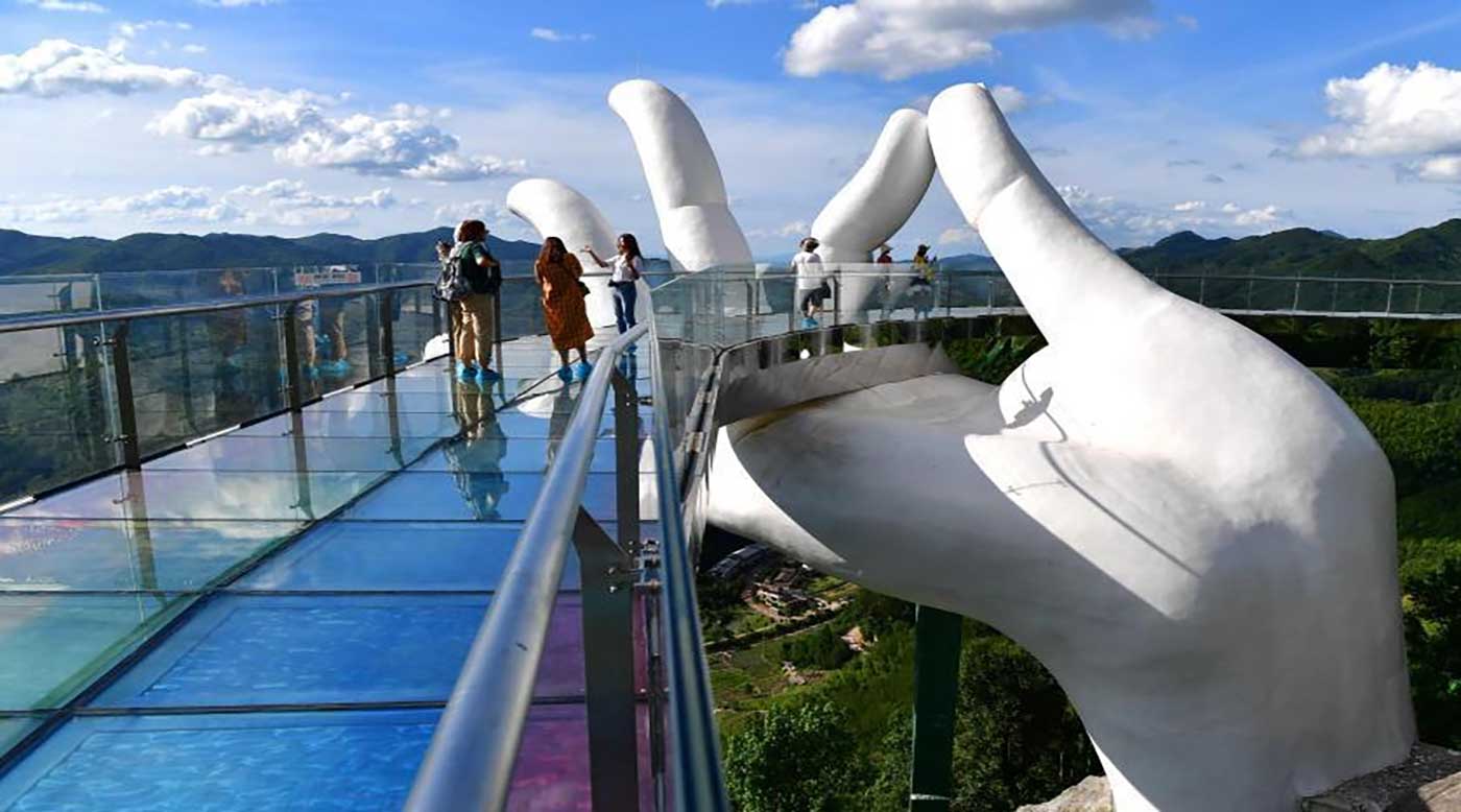 افتتحت الصين في أغسطس الماضي جسراً سياحياً شبيهاً بالجسر الفيتنامي، يخيل أنه ممسوك بأصابع اليد.