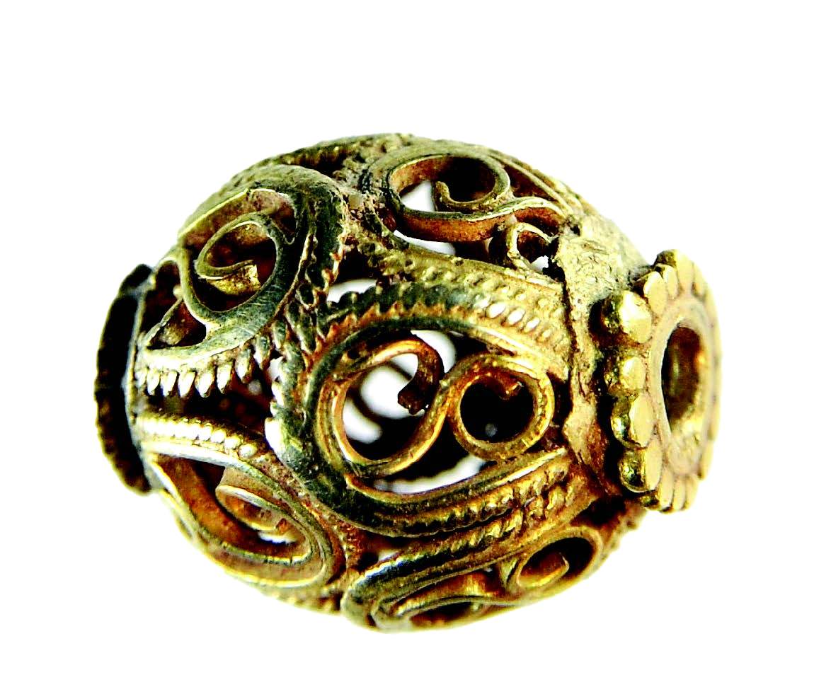 تم إيجاد خرزة ذهبية في حفريات موقع جميرا الأثري، من الذهب الخالص، تحتوي على زخارف نباتية مفرغة، وزوايا هندسية دائرية وبيضاوية، تعكس مهارة الصانع القديم.
